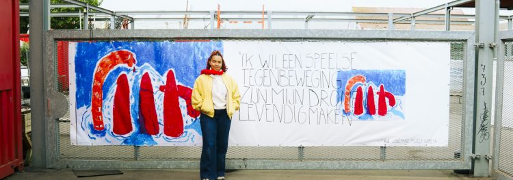 “De kleuren die ik gebruik is mijn activisme tegen het grauwe om me heen. Ik wil een speelse tegenbeweging zijn. Mijn dromen levendig maken. Tegelijkertijd is deze schets de pijn die ik ondervind in de relatie tussen de mensen rond me.”