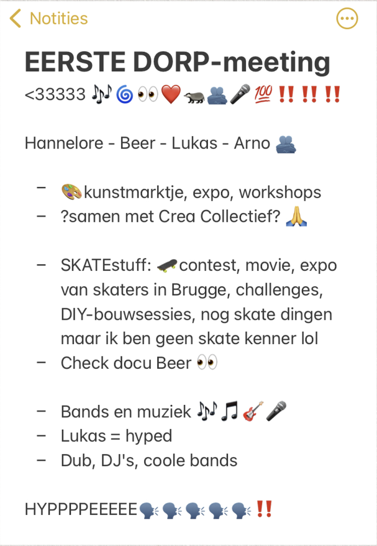 Op 29 april en 3 mei vonden de eerste DORP-meetings van dit jaar plaats. Tijdens deze sessies werd er gebrainstormd en werden de eerste ideeën op tafel gelegd. Enkele grote thema’s kwamen naar voren: muziek, skate en kunst. Lees de notities van de DORP-coördinator hiernaast.